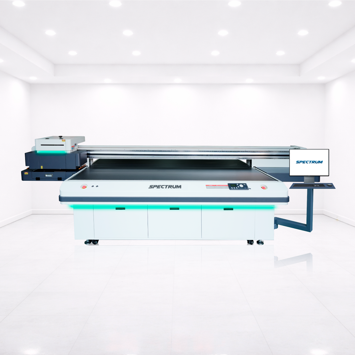The Spectrum FB-2513 is a UV LED flatbed printer, configurable with 2 to 14 Ricoh Gen6 heads, offering a print resolution of up to 1200 dpi. With a print area of 2500 mm x 1300 mm and the ability to handle substrates up to 300 mm thick, it is perfect for large-format projects, complying with environmental standards.