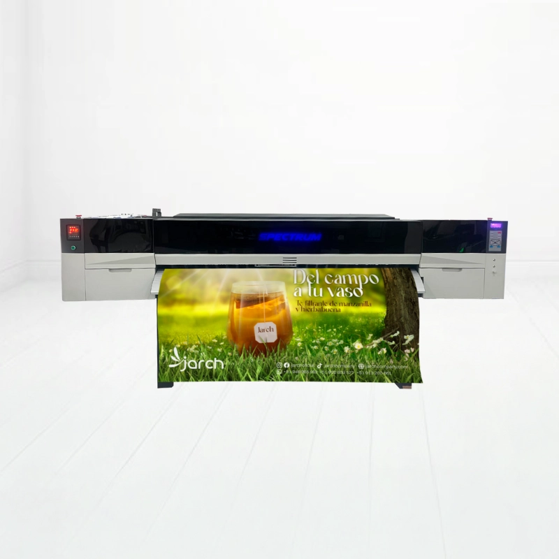 The Spectrum RTR-1800 Roll-to-Roll UV LED printer is designed to deliver exceptional performance in large-format printing. With the capacity to use up to 4 Epson i3200 heads, it allows for print quality of up to 2400 dpi. Its efficient design and compatibility with 9 colors, including fluorescent options, white, and varnish, make it ideal for a variety of commercial applications. With a printing width of up to 1800 mm, it is perfect for rolls of vinyl, backlit, banners, photographic paper, canvas, linen, and other substrates, maximizing versatility in advertising, decoration, and signage projects.